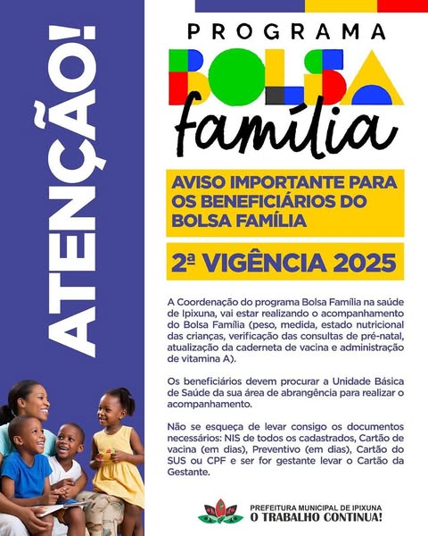 A Prefeitura de Ipixuna-AM, por meio das secretarias de Assistência Social e Saúde, informa que a 2ª vigência da pesagem do Bolsa Família começa nesta segunda-feira, 4 de agosto 4 de agosto de 2025