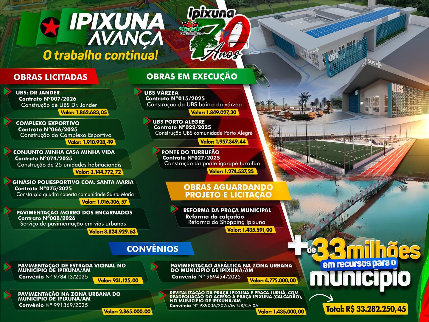 São mais de R$ 33 milhões em investimentos destinados à saúde, infraestrutura, esporte, habitação e mobilidade, garantindo mais qualidade de vida para população.
